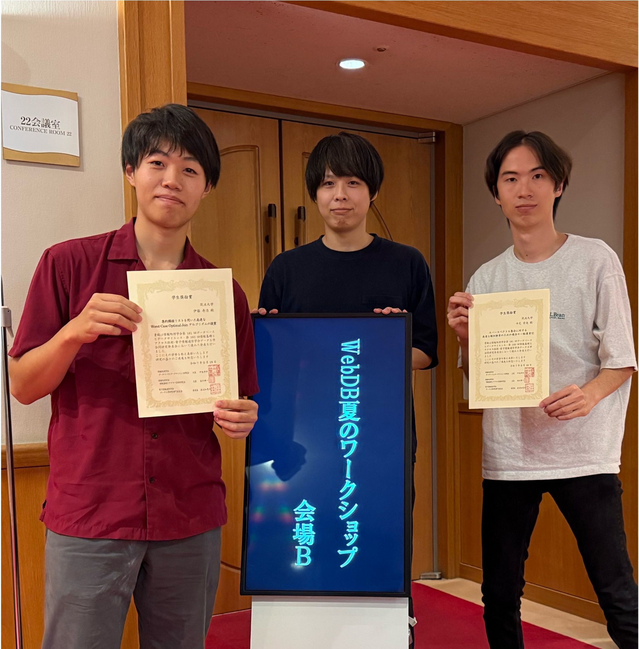 The Student Research Awards were respectively presented to Mr. Toshihiro Itoh (M2 student in CS Program) and Mr. Sakuzo Ushiama (M2 student in CS Program) under the supervision of Prof. Hiroaki Shiokawa (CCS), at WebDB Workshop 2025, held on September 16th-18th, 2025.