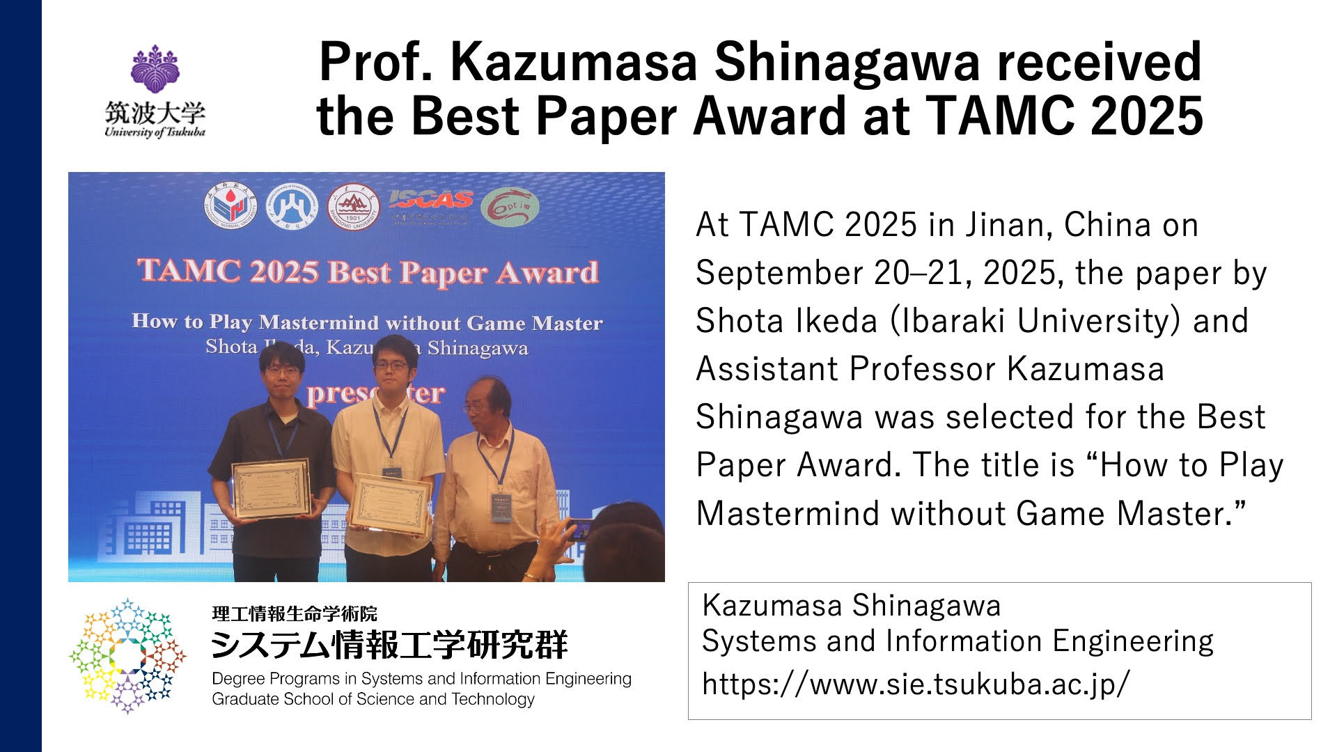 At TAMC 2025 in Jinan, China on September 20–21, 2025, the paper by Shota Ikeda (Ibaraki University) and Assistant Professor Kazumasa Shinagawa was selected for the Best Paper Award. The title is “How to Play Mastermind without Game Master.”