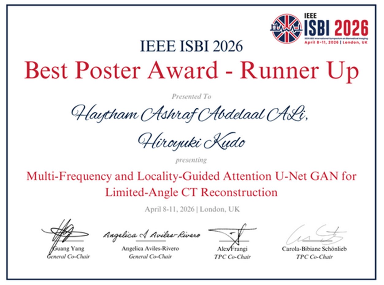 外国人受託研究員(JSPS外国人特別研究員)Haytham A. Ali氏と工藤博幸教授の論文「Multi-Frequency Locality-Guided Attention U-Net GAN for Limited-Angle CT Reconstruction」が、ロンドンにて開催された国際会議IEEE International Symposium on Biomedical Imaging (ISBI) 2026においてBest Poster Award: Runner Upを受賞しました。289件のポスター発表の中で第2位の高い評価を受けました。内容は、CT分野で難しい問題とされている角度欠損がある投影データからの画像再構成問題に対して、独自の巧妙なattention機構を組み込んだ敵対的生成ネットワークGANに基づく手法を提案して、通常の1/4に相当する僅か45度角度範囲の投影データから高画質の画像生成に成功したという内容です。